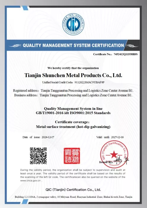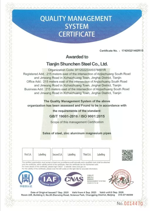 Caighdeáin: GB/T 3091-2015 "Píopaí Cruach Táthaithe le haghaidh Iompar Sreabhán Ísealbhrú", GB/T 13912-2020 "Feadáin Cruach Ghalbhánuithe Te-tumtha". Tá an táirge tar éis tástáil tríú páirtí a rith agus tá tuarascáil tástála aige.