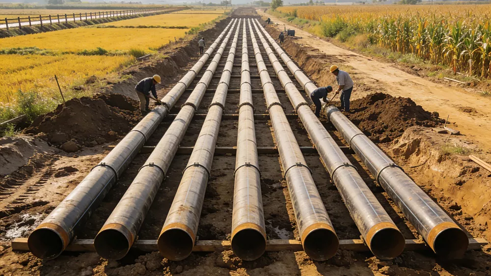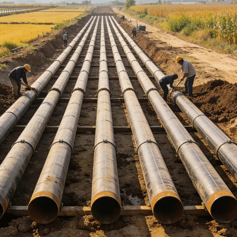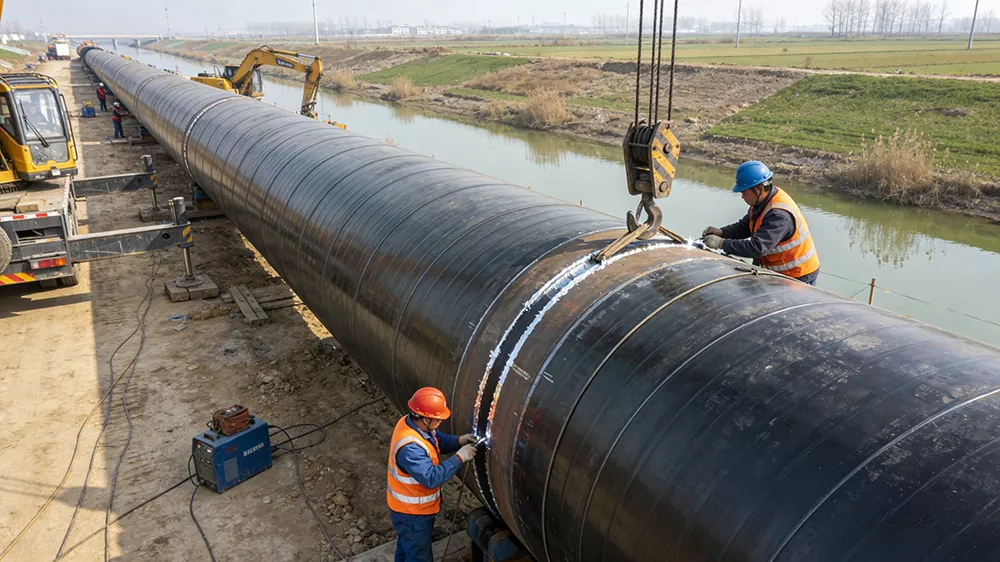 Cásanna is infheidhme: Tionscadail atreoraithe uisce ar scála mór, tionscadail aistrithe uisce, tionscadail rialaithe tuilte agus draenála, príomhphíblínte le haghaidh uisciúcháin talamh feirme, tionscadail soláthair uisce le haghaidh uisce óil, tionscadail soláthair uisce oileáin, etc. Is iad na croíriachtanais cumas sreabhadh ard, friotaíocht creimeadh, agus friotaíocht brú uisce. Is féidir iad a oiriúnú do thimpeallachtaí casta mar ghrinneall abhann, tailte a bhfuil tionchar ag salann orthu, srl. Is féidir leo creimeadh uisce agus turnamh geolaíochta a sheasamh go héifeachtach, tarchur cobhsaí acmhainní uisce a chinntiú agus oibriú sábháilte na dtionscadal caomhnaithe uisce a ráthú. Tá ról tábhachtach tacaíochta acu sna príomhthionscadail náisiúnta caomhantais uisce. Cur síos ar an radharc: Ag láithreán tógála Thionscadal Athstiúrtha Uisce Jinghai, úsáidtear píobáin bíseach ar thrastomhas mór chun príomhphíblíne a leagan. Téann na píopaí trí aibhneacha nó tailte feirme, agus déanann oibrithe cóireáil séalaithe comhéadain. Ag suíomh tionscadail soláthair uisce an oileáin, úsáidtear píopaí bíseach mór-trastomhas le teicneolaíocht frith-chreimeadh 3PE chun seasamh in aghaidh creimeadh uisce farraige agus idirnascadh acmhainní uisce idir an oileán agus an mórthír a bhaint amach.