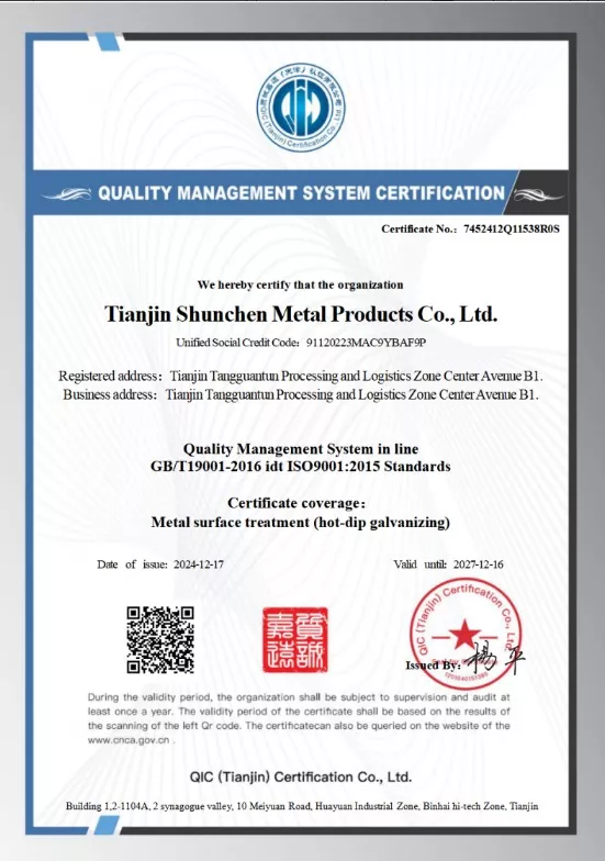Tá deimhniú cáilíochta ISO9001 faighte ag Rannóg U Cruach Shunchen Industrial, a chomhlíonann caighdeáin náisiúnta. Soláthraímid tuarascálacha tástála ábhair tríú páirtí agus deimhnithe tiús ghalbhánuithe. Úsáideann ár dtáirgeadh ardlínte táirgeachta, ag dul faoi 12 chéim dhianphróisis, arna neartú le breis agus 20 bliain de shaineolas táirgthe. Tá cuntas teiste 12 bliain coinnithe againn maidir le sárú conartha nialasach agus náid teagmhas cáilíochta bliantúil. Le linn an phróisis táirgthe, cuirtear trí chóireáil pasivation i bhfeidhm chun friotaíocht frith-alcaile táirgí ghalbhánuithe a fheabhsú. Déantar gach táirge críochnaithe a thriomú, a iniúchadh agus a chríochnú sula ndéantar é a phacáistiú agus a sheoladh. Tá deimhnithe córais ISO 9000, 3A, agus deimhniú CE an AE ag an gcuideachta. Leis an 12 chéim phróisis atá againn agus meicníocht iniúchta cuimsitheach trí chiseal, tá náid teagmhas cáilíochta agus sábháilteachta bliantúil bainte amach againn agus coinníomar taifead 12 bliain de sháruithe conartha nialasach.