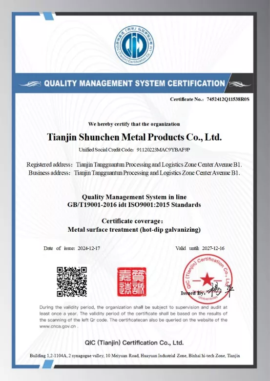 Tá taithí na mblianta ag Tianjin Shunchen i dtáirgeadh, le líne táirgeachta a chuimsíonn slabhra iomlán an tionscail. Tá deimhniú córas bainistíochta cáilíochta ISO 9000, deimhniú creidmheasa 3A, agus deimhniú CE an AE ag an gcuideachta, a leagann bunús láidir cáilíochta. Trí dhá shreabhadh próisis dhian déag agus meicníocht iniúchta cuimsitheach trí-chiseal, tá taifead nialasach tionóiscí cáilíochta agus sábháilteachta bliantúil bainte amach ag an gcuideachta. Le dhá bhliain déag anuas, níor tharla sárú conartha ar bith maidir le seachadadh ordaithe, rud a léiríonn leibhéal ard iontaofachta. Soláthraíonn an tsamhail chomhtháite táirgeachta agus díolacháin, in éineacht le cumas stórais 10,000 méadar cearnach, seirbhísí soláthair aon-stad do chustaiméirí. Clúdaíonn an córas tacaíochta iar-díola an timthriall iomlán, ag tairiscint freagra 24/7. Is féidir orduithe a rianú i bhfíor-am trí ocht nód déag, rud a chinntíonn próiseas trédhearcach agus inrialaithe.